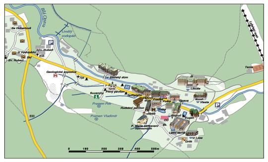 Na stravování se dochází do Lázeňského domu Libuše (docházka 100 m), na procedury pak do Letních lázní (docházka cca 300 metrů).